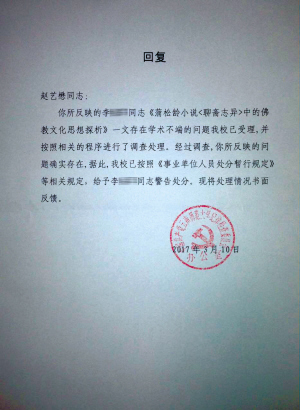 记者看到,在这份盖有“云南师范大学纪律检查委员会”公章的回复中,校方称:经过调查,赵艺懋“反映的问题确实存在”,据此,学校“已按照《事业单位人员处分暂行规定》等相关规定,给予李××同志警告处分”。