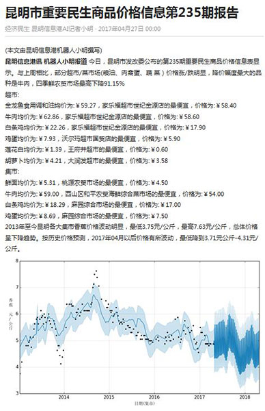 昆明信息港讯 “2013年至今昆明各大集市香蕉价格波动明显,最低3.75元/公斤,最高7.63元/公斤,总体价格呈下降趋势。”你能看出这句话是机器人写的吗?日前,云南首个写稿机器人公开测试,稿件内容涉及出行、天气预警、民生菜价、演出活动等。这款机器人取名“小明”,由昆明报业传媒集团昆明信息港互联网应用技术研究所自主研发。