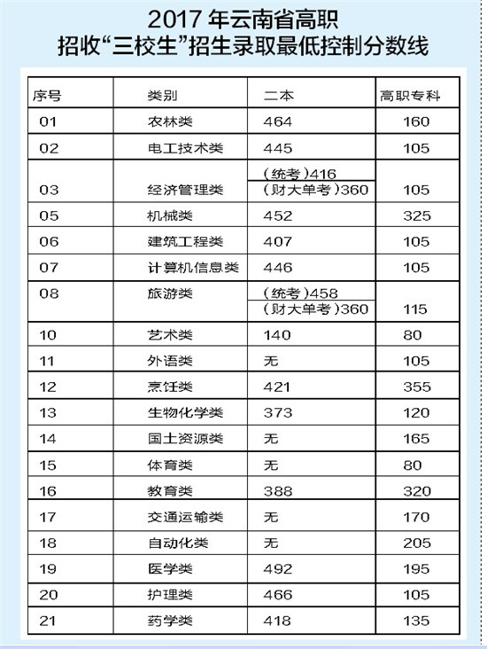 与此同时,根据省招考院公布的“2017年云南省高职招收“三校生”招生录取最低控制分数线”显示。其中,农林类二本批次最低录取控制分数线464分,高职专科批次160分;电工技术类二本批次445分,高职专科批次105分;经济管理类二本批次(统考)416分,(财大单考)360分,高职专科批次105分;机械类二本批次452分,高考专科批次325分;建筑工程类二本批次407分,高职专科批次105分;计算机信息类二本批次446分,高职专科批次105分;旅游类二本批次(统考)458分,(财大单考)360分,高职专科批次115分;艺术类二本批次140分,高职专科批次80分;外语类高职专科批次105分;烹饪类二本批次421分,高职专科批次355分;生物化学类二本批次373分,高职专科批次120分;国土资源类高职专科批次165分;体育类高职专科批次80分;教育类二本批次388分,高职专科批次320分;交通运输类高职专科批次170分;自动化类高职专科批次205分;医学类二本批次492分,高职专科批次195分;护理类二本批次466分,高职专科批次105分;药学类二本批次418分,高职专科批次135分。
