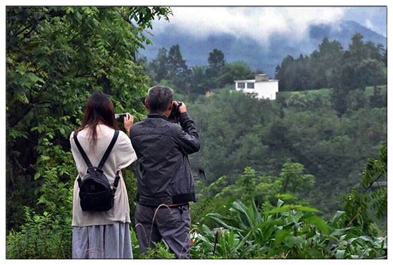在槽沟,刚刚饱览钟鸣半是盆景半是山风景的采风团走入农户家中,沉浸在田园风光里。槽沟在钟鸣镇边缘,有山区少见的人工鱼塘,养鱼的水引自1公里外的溶洞,养殖的草、鲫、鲢等鱼经科学配比,不喂人工饲料,只用田间地头的野草,发展出帮助农民增收的新产业,又保持了良好的生态。在农家小院,诗人们纷纷以山峦流云为背景合影留念。