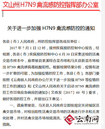 7月1日晚间,记者从中共文山州委宣传部获悉,文山州H7N9禽流感防控指挥部办公室发布通知称,在麻栗坡县莱溪综合菜市场和马关县新菜市场检出H7N9禽流感病毒核酸阳性,疫情有进一步扩散的可能。下一步两县将对检出H7N9阳性活禽交易市场的活禽进行扑杀和无害化处理。