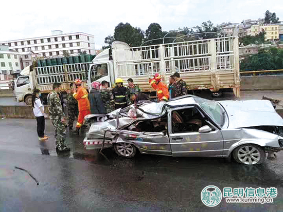 昆明信息港讯(都市时报 记者黄朝红) 昨天下午5点10分左右,一辆宜良万能驾校的教练车在刚过小喜村收费站前方2公里左右路段处撞上隔离墩,造成车辆仰翻在隔离墩上,车上1人当场死亡,1人重伤,3人轻伤。因隔离墩被撞开,随后又有1辆小货车和1辆微型车撞上去,造成现场堵车1个多小时。