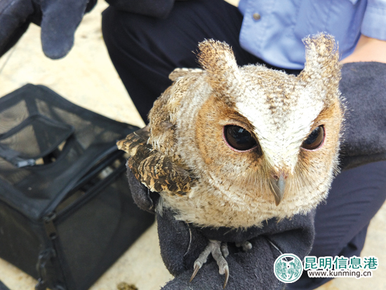 民警将鸟儿捕获后带回单位,经查询,确定这是一只国家二级保护动物——领角鸮,是猫头鹰的一种,身体健康,没有外伤。当天,森林民警将领角鸮带到野外,放归大自然。