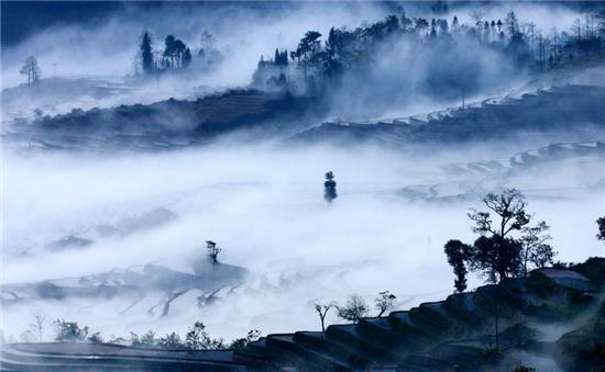 从多依树的景观台往里走大概4-5公里左右就到爱春,这里是拍摄蓝梯田的地方。其实蓝梯田哪里都可以拍摄,但必须在合适的光线下,顺光,而且和梯田的角度不能太大。爱春恰好就在路边,可以下到梯田里去拍摄,所以梯田非常蓝。拍完多依树之后最应该去爱春,在一月份,上午9点左右这段时间就梯田拍出来最蓝的时候。