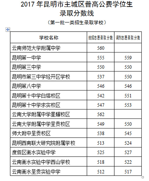 昆明信息港讯 记者上官艳君 7月24日,2017年昆明市普高第一批次录取分数线正式揭晓。今年,共有所5学校统招志愿录取分数线超过了550分。其中,云大附中星耀校区分数线最高,为562分;其次是云师大附中,为560分;此外,昆一中为555分,昆三中为550分,师大实验中学为550分。