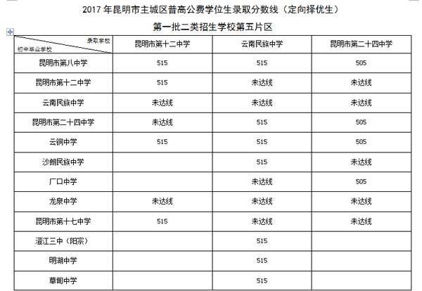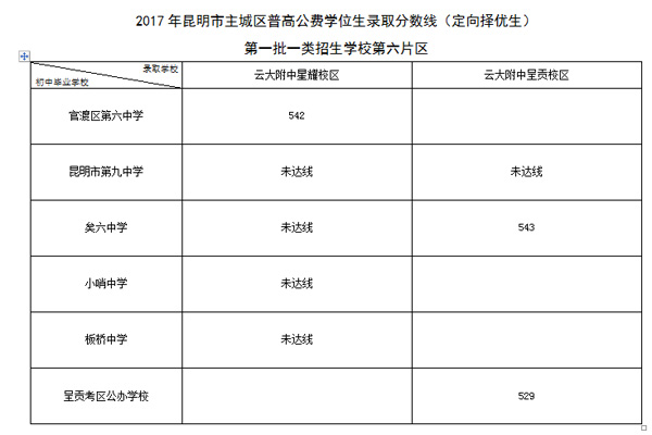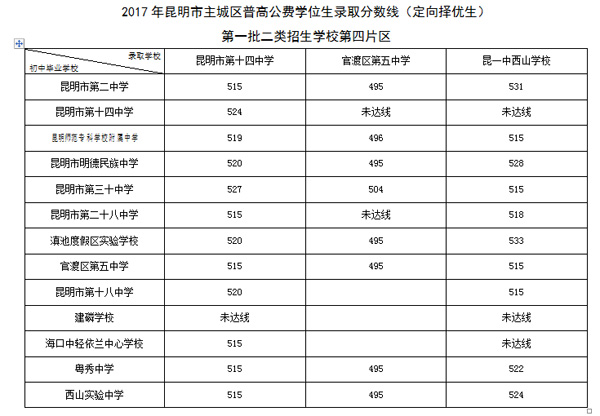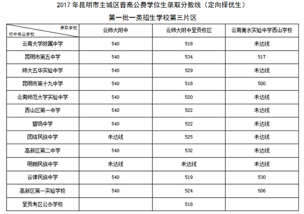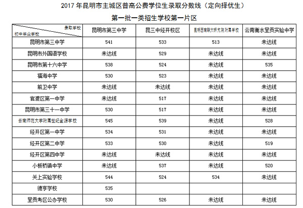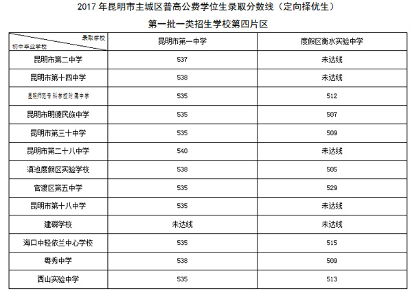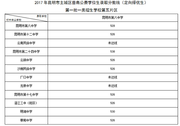 当日,还公布了2017年昆明市主城区普高公费学位生录取分数线(定向择优生)。具体如下: