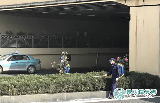 盘龙区卫计局工作人员在北站隧道周围喷洒消毒剂 供图