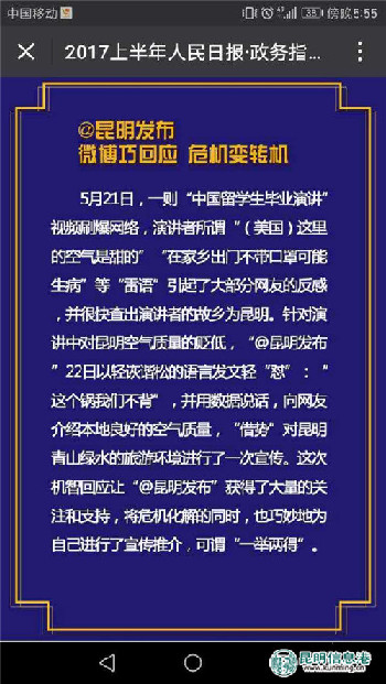 在应急处置方面,本届峰会发布的《影响力报告》对“昆明发布厅”的一个应急回应案例进行了展示。案例显示,2017年5月21日,一则“中国留学生毕业演讲”视频刷爆网络,演讲中“(美国)这里的空气是甜的”、“在家乡不戴口罩可能生病”等“雷语”引起了众多网友的议论,并很快查出演讲者的故乡是昆明,网络舆论焦点很快转向了昆明。面对该事件中网友们关于昆明空气质量的争论,“@昆明发布”并没有选择沉默,而是以轻松、诙谐的语气轻“怼”网友:“这个锅我们不背”,并用数据说话,与“昆明发布厅”成员单位“@昆明气象”、“@昆明市环保局”联动,向网友介绍了昆明良好的空气质量,同时“借势”对昆明青山绿水的生态环境和旅游资源进行了一次宣传,完成了一次良好的城市形象联动宣传。《影响力报告》评价称:这次机智的回应让“@昆明发布”获得了大量的网民关注与支持,在将危及化解的同时,也巧妙地为昆明市进行了宣传推介,可谓“一举两得”。