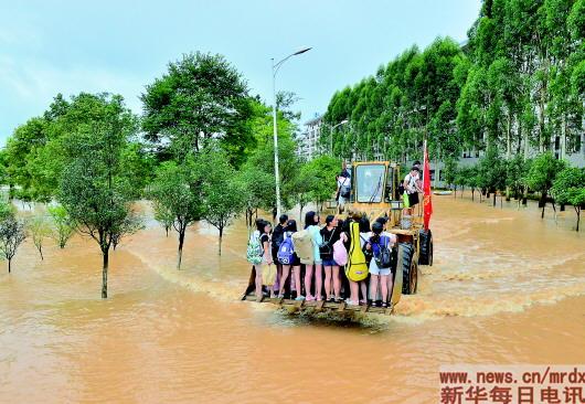 7月3日,救援的铲车将桂林旅游学院受困学生转移到安全地带。新华社发(李绚丽摄)(资料照片)