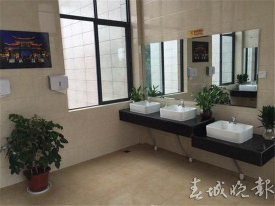 除了公厕必备的硬件外,这座目前昆明最大的公厕,在软件上也下了一番功夫,按照净化、绿化、美化的标准进行了设计。包括官渡古镇在内的一些“官渡元素”,都出现在了墙面的装饰上。在公厕内还配置了免费的卫生纸、洗手液、风干机和大量绿植。值得注意的是,公厕配备了第三卫生间,除了残疾人专用的卫生间外,还根据老人、小孩的不同特征,设置了扶手、防滑地面、儿童坐便器等设施。同时,还专门开辟了一间“爱心驿站”,为城市环卫工人提供免费的休息场所。