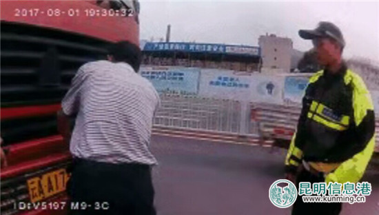 昆明信息港讯 记者合宇聪 记者从昆明市公安局交警支队九大队获悉,8月2日晚7时许,交警九大队骑警在春雨路和益宁路交叉路口处理违章时,一辆号牌为云AA1737的重型罐车沿春雨路行驶过来,驾驶人见前方有骑警,便立即拉动手中的绳子,将遮挡在车辆号牌上的线手套拉开。然而驾驶人万万没想到其自以为“神不知鬼不觉”的小动作早已被细心的骑警尽收眼底。