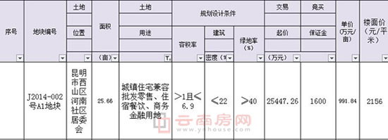根据昆明市国土资源局发布的地块出让信息,位于昆明市西山区河南社区居委会的地块编号为“J2014-002号A1地块”,出让面积为17105.2平米(约25.66亩),土地性质为城镇住宅兼容批发零售、住宿餐饮、商务金融用地。该地块规划设计条件为容积率>1且≤6.9,建筑密度≤22,绿地率≥40。