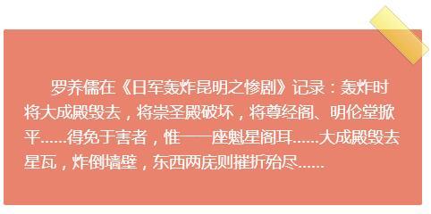 1938年,首次侵入昆明的一架日本轰炸机被击落,并于1941年运到文庙的魁星阁前陈列。日军闻讯后,于当年1月29日派机群来袭。文庙东西巷,文庙直街、横街以及文庙大门被炸成一片废墟。