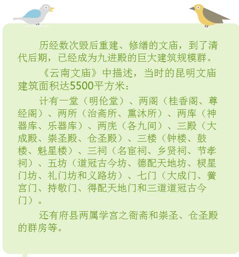 当时,昆明这座文庙已经形成了风格自成体系的建筑群,有中轴线,坐北朝南,在中轴线上建了棂星门、大成殿、崇圣祠等建筑。