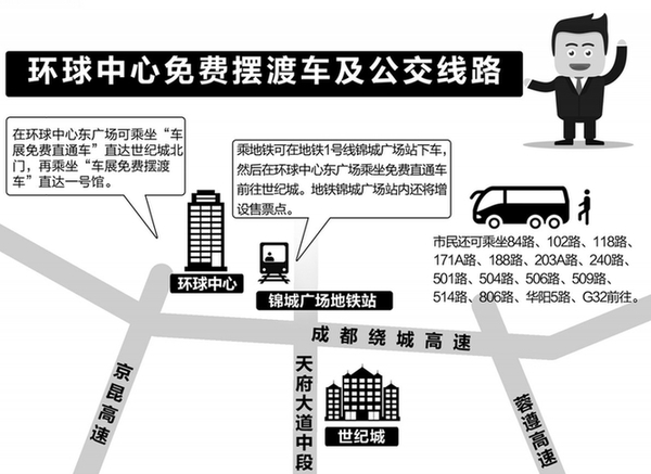 对于自驾前往的市民,请注意绕城高速锦城湖出口、天府大道沿线等多个路段都设有交通指示牌,引导私家车驶入环球中心停车场。在环球中心东广场可乘坐“车展免费直通车”直达世纪城北门,再乘坐“车展免费摆渡车”直达一号馆。