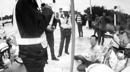 在交警劝说下电动车司机赵某爬上岸