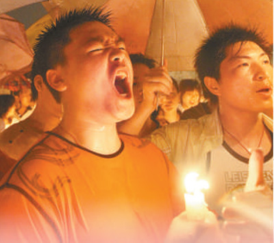 汶川地震发生后,广东佛山市民在暴雨中高唱国歌。资料图片