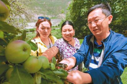 对口帮扶巴塘县以来,成都市双流区多次组织专家赴巴塘进行科技帮扶。图为近日四川省苹果种植专家谢红江(右)在夏邛镇独角龙村讲解果树管理技术。 袁浩/摄(视觉四川)