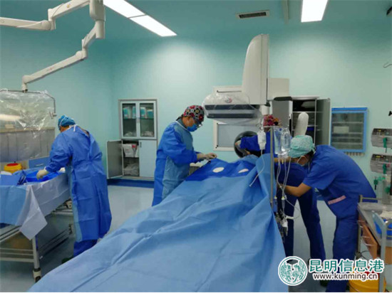 在患者家属手足无措的时候,医院的急诊医生过去安抚一旁家属的情绪,耐心的告知家属患者病情以及立即通过介入手术迅速开通闭塞冠状动脉的必要性,家属当即决定同意手术。云南省阜外医院立即启动急诊冠脉介入(PCI)程序,因术前准备充分,介入导管室医护技等人员早已到位,患者立即被转运到导管室进行急诊冠脉介入治疗。
