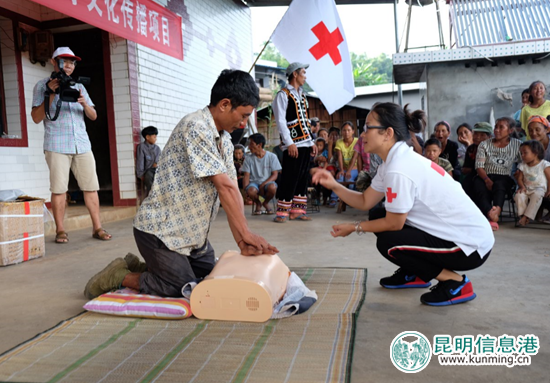 耿马县红会赈济救护股师资杨丽向村民培训心肺复苏和包扎止血方法等应急救护技能