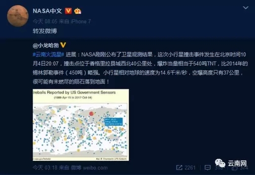 当日晚20时左右,云南大理和丽江网友朋友圈被一则“陨石”、“流星”滑落的短视频霸屏,引发多人关注和热议。在网友提供的视频中,云南网注意到,漆黑的夜空中突然闪现一团亮光,如同火球一般迅速滑落,其周边的云朵瞬间被照亮,整个过程不超5秒。