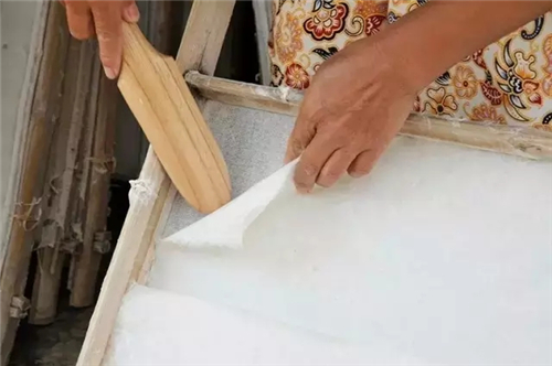 纸晒干后,先用手撕开一个角,然后就用很光滑的揭纸木刀轻轻滑动将纸和纱布分开、揭下整张纸。纸揭下后就按需要折叠打捆。