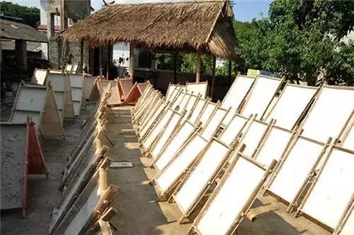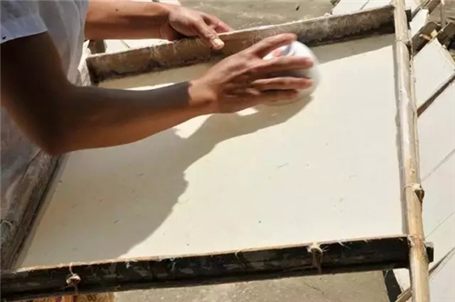 将浇好的纸连同纸模一起抬到阳光下暴晒,晒时一定要注意天气变化。没有阳光时也可用火烘烤。