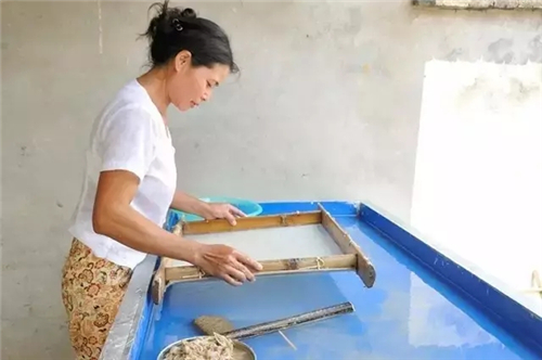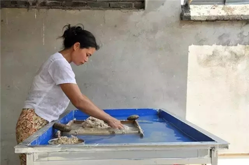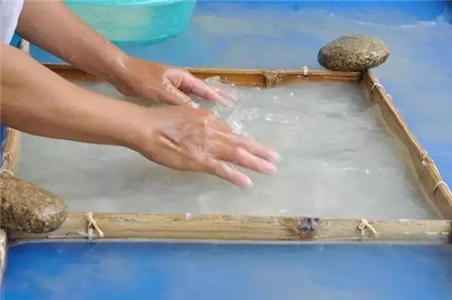 先在纸床里盛上七分满的清水,然后将纸模放入纸床里的水中用石块固定,再将适当份量的浆撒在纸模里。放入纸模里的纸浆量多少全靠个人经验。先用双手搅开纸浆,再用棒均匀拍打,待纸浆均匀沉淀到白纱布上后再移动石块,慢慢倾斜着竖起纸模,让水滤干后再到阳光下晒干。