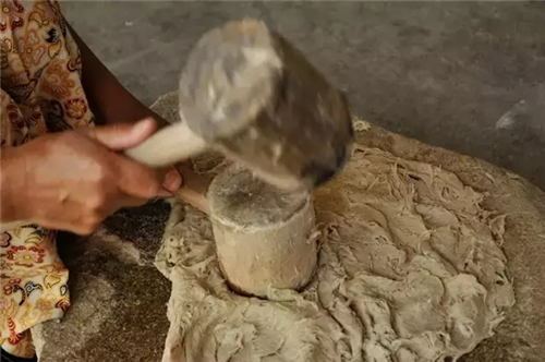 将清洗干净的构皮置于石墩上,用酸角树制成的木锤反复捶打上百次,直到将构皮捶打成能够在水中自然散开的纤维为止。