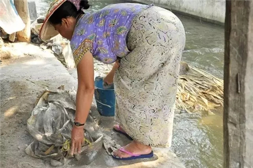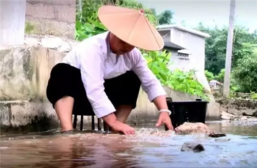 构皮煮透后,挑到溪流之中,让水将附着在构皮上的火灰冲走,同时用手不断浣洗,并将杂质及硬物清理干净,直到没有杂质为止。