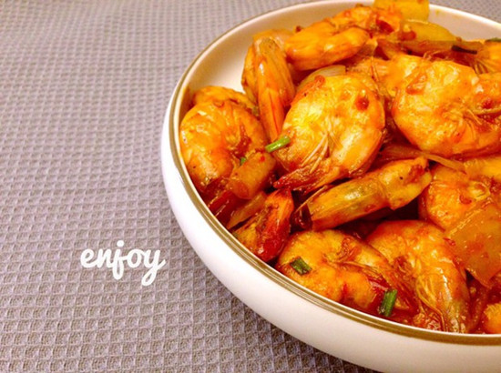 做法:五花腩洗净沥干水分切碎备用;罗氏虾去掉虾脚洗净沥干水分,用平底锅煎至外皮香脆后备用;京葱洗净切段备用。开锅下油,爆香五花腩碎至油分溢出,下京葱,加入适量面酱、柱侯酱翻炒片刻,放罗氏虾,调味后炒片刻上碟即成。