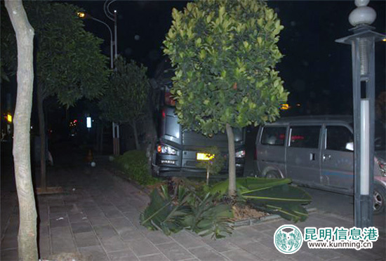 老司机停车忘拉手刹 大货车半夜溜进绿化带