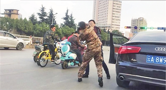 记者从路人提供的视频看到:一位身穿黑色外衣的奥迪车司机指着身穿迷彩服的电动车车主说着什么,电动车车主用手指着奥迪车司机说:“我没看到你转弯啊。”奥迪车司机继续用手指着电动车车主大骂,电动车车主就朝奥迪车司机挥出拳头,于是,两人就扭打起来。奥迪车司机边躲闪边还击,差点被经过的一辆电动车撞到。两人从车尾打到车前又从车前打到车尾,最后打到了东陆桥上。路人见状,上前拉开两人,双方这才罢手。
