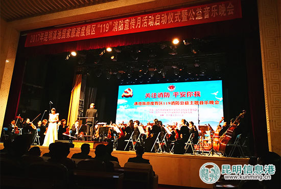 昆明信息港讯 实习记者劳学丽 11月9日晚,2017年昆明滇池国家旅游度假区“119”消防宣传月活动启动仪式暨公益音乐晚会在昆明抗战胜利纪念堂举行。昆明聂耳交响乐团为昆明市公安消防支队滇池度假区大队(以下简称“滇池度假区大队”)的消防官兵们带来一场音乐的盛宴。