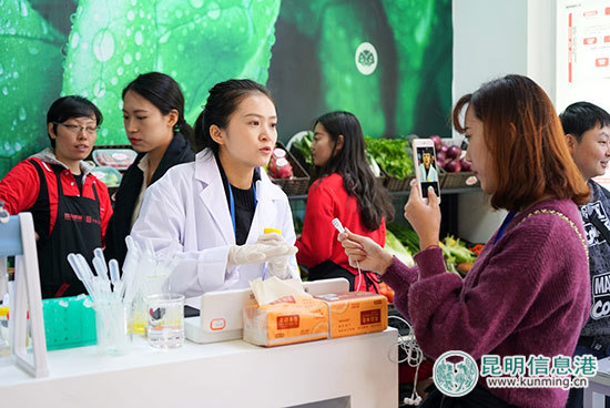 国资商城展厅为了让市民对绿色、健康农业、农产品有一个更为直观、深刻的了解,不仅展示了其倾力打造的“智慧农业”大数据平台,在现场准备了尼西鸡、藏香猪肉等高原特色农产品的免费试吃活动,还在其展位放置了三台专业检测设备,对其展出的相关产品进行现场检测。