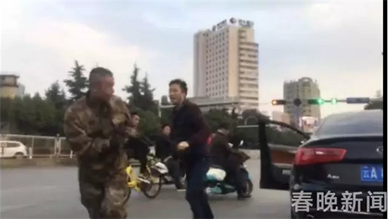 站在一旁观望的其他市民劝阻到,“算了,算了,别打了。”但是,扭打在一起的两人并未停下手中的拳头,奥迪车司机一边躲闪一边还击,途中差点被经过的一辆电动车撞到。两人从车尾打到车前,又从车前打到车尾,最后还打到了东陆桥上。