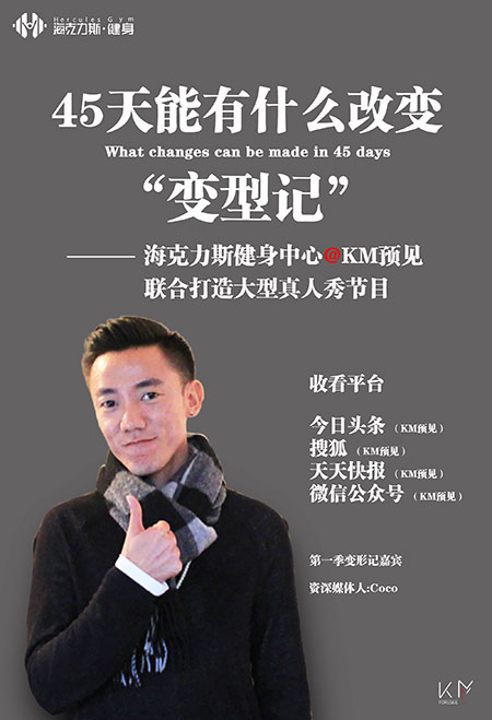 做为节目第一期嘉宾,资深媒体人COCO向我们介绍到,他一直都很想健身,但又怕健身,担心达不到预期效果,45天,对于他的挑战还算蛮大的。由于他体质较瘦弱,想增肌,没有任何健身经验的他,正是适合“变型计”的要求,三个专业教练和一个营养师将在这段时间,将会每天陪伴着他,针对不同部位进行训练及营养搭配。如果你也想成为下一期“变型记”嘉宾,可与海克力斯健身中心前台联系,有可能下一期改变的人就是你!