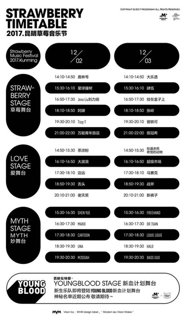 除颇受期待的演出阵容外,全新血液的注入也为2017昆明草莓音乐节带来了不少惊喜。摩登天空于2017年开启了针对中国新锐年轻人的“Young Blood新血计划”,它的创立是致力于探索新一代年轻人的内在价值,支持新青年创造心中所想。