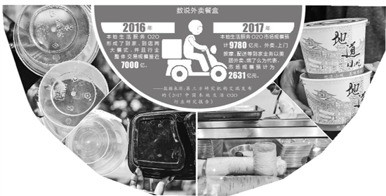 有媒体以“7000亿整体交易规模、中国市场用户规模6亿、消费频次每周消费3次以上”3个数据,算出了国内每周最少有4亿份外卖飞驰在大街小巷的数据,这等于4亿个一次性打包盒和4亿个塑料袋以及4亿份一次性餐具将被废弃。