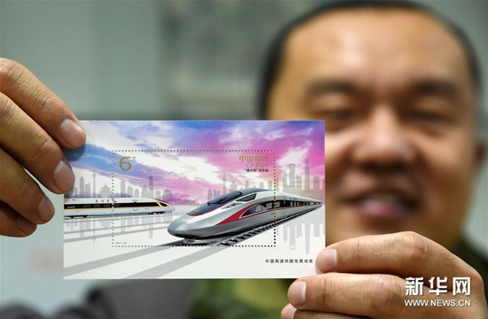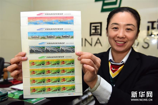11月25日,中国邮政集团公司河北省邯郸市分公司工作人员展示《中国高速铁路发展成就》纪念邮票小型张。 新华社 郝群英/摄