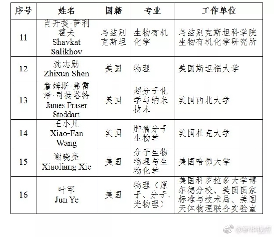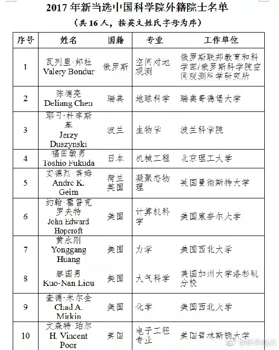 另外,16人新当选为中科院外籍院士,其中有2位诺贝尔奖获得者。