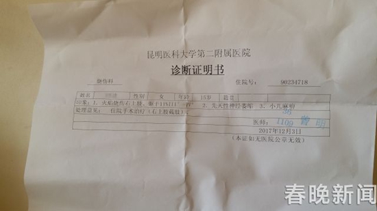 叶琴说,来到昆明医科大学第二附属医院经过医生检查,由于妹妹的右手严重烧伤,医生说要截肢。