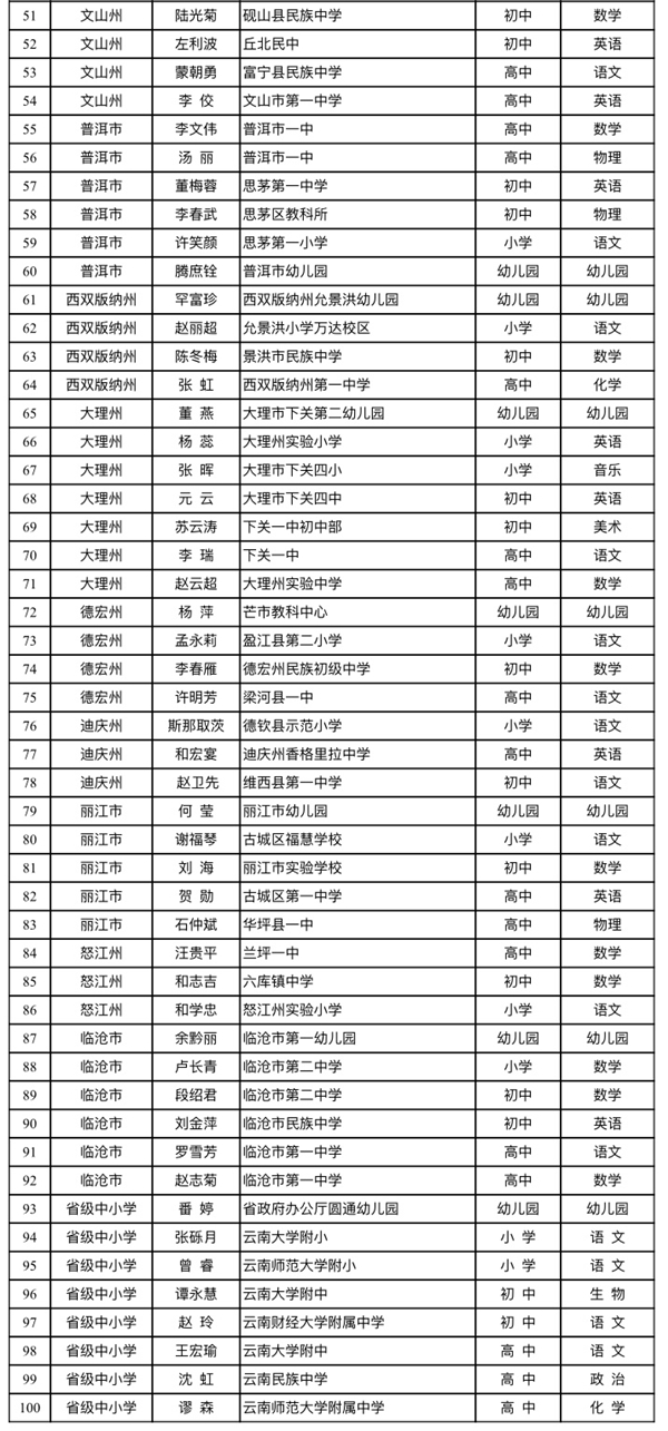 昆明信息港讯 记者上官艳君 12月7日,记者从省教育厅获悉,云南省“国培计划”项目中小学名师工作坊和名校长工作坊坊主名单揭晓。经专家评审,我省100名教师拟入选云南省“国培计划”项目中小学名师工作坊坊主,30名校长拟入选名校长工作坊坊主。