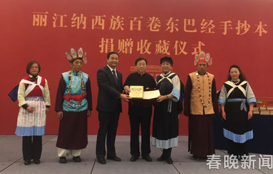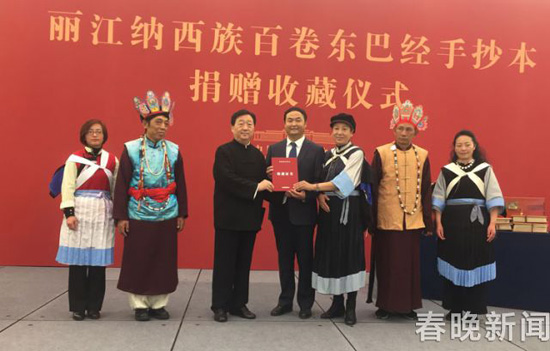 云南省丽江市委市政府向国家博物馆捐赠了《云南丽江纳西族百卷东巴经手抄本(中国国家博物馆收藏版)》及《纳西东巴古籍译注全集》(100卷)。中国国家博物馆馆长吕章申向捐赠方颁发了捐赠收藏证书。这标志着《云南丽江纳西族百卷东巴经书》被中国国家博物馆收藏。