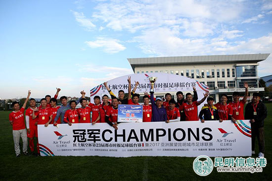 昆明信息港讯 记者戴兴 12月10日,经过为期一个多月的较量,“红土航空杯”第23届都市时报足球擂台赛暨2017亚洲展望昆明城市足球联赛在红塔体育中心落下帷幕,红土航空在决赛上通过点球大战战胜昆明东远足球俱乐部,首次捧起了擂台赛的冠军奖杯,昆明东远足球俱乐部、昆明足协U16队分获亚军和季军。
