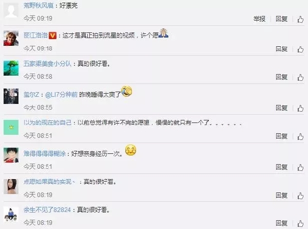 昨晚,看到流星雨的小伙们,注定和浪漫相随,据说,一个小时会有120颗流星滑落,1个小时120个愿望,小伙伴们,你许了几个?