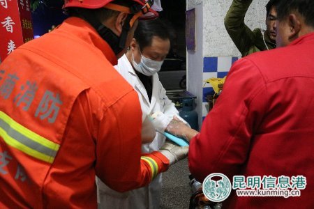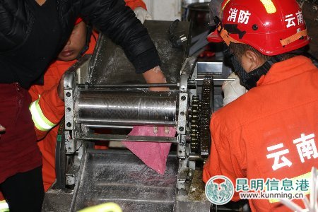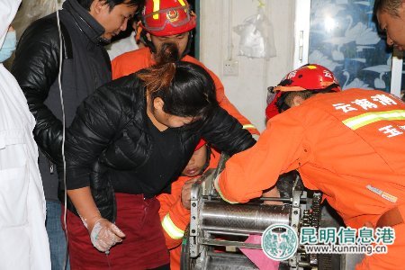 昆明信息港讯 实习记者劳学丽 12月25日凌晨5时30分,玉溪市公安消防支队元江大队接到报警称,位于元江县建设银行旁一名女子被和面机器夹住了手,情况十分危急,该大队立即出动1车7人赶往现场救援。