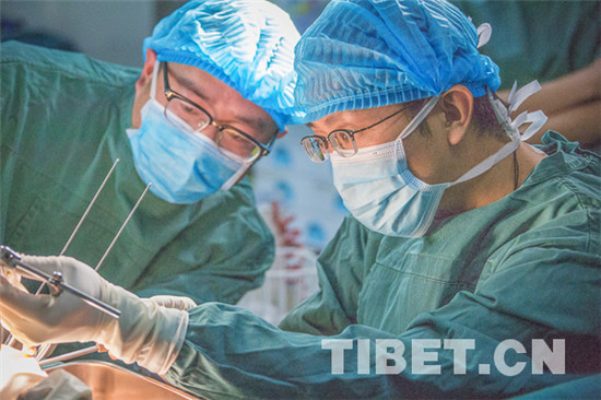 “麻烦把灯对过来。冲洗一下。持骨钳递过来。灯再过来一点。注意观察患者的心率情况。我们要仔细寻找这里面的碎骨,如果碎骨找不干净,后面患者要面临着更多的痛苦。你们看,这个白色的就是碎骨,一定要记住这个碎骨的位置,这样患者的后期治疗,就会比较清楚。”拉萨市人民医院骨科主任龚晓峰一边认真手术,一边给学生讲解手术的注意事项。整个手术室,除了龚晓峰的说话声和心率仪发出的声音,一切都很安静的。虽无语言交流,但是每个人都在有条不紊地完成着自己的工作。