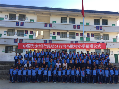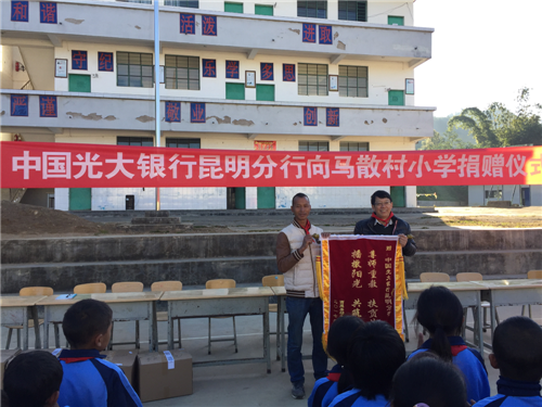 马散村李主任对光大银行昆明分行长期以来的支持和关心表示感谢。李主任讲到马散村地离昆明近800公里,是云南省脱贫攻坚重点对象。在光大银行的定点帮扶下,马散村这几年来发生了很多可喜的变化。村里1500头高品质肉牛养殖场已经初具规模,种猪场已经开始运营,高原特色的油辣椒、米荞、中药材的种植也在快速发展。马散村小学原来只有几栋破房子,今年,新教室、新宿舍楼已经建起来,一至六年级已设置齐全,一百多个孩子都穿着光大银行捐赠的统一校服高高兴兴地来上学。尤其是光大银行捐赠建立的阳光书屋,有3000多本书和崭新的桌椅板凳,给孩子们带来了知识和希望。马散村当即回赠了光大银行“尊师重教、扶贫扶智、播撒阳光、共筑希望”的锦旗表示感谢。