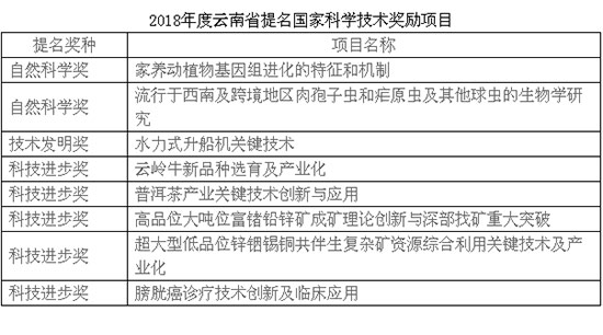 2018年度云南省提名国家科学技术奖励项目分别是:家养动植物基因组进化的特征和机制(自然科学奖)、流行于西南及跨境地区肉孢子虫和疟原虫及其他球虫的生物学研究(自然科学奖)、水力式升船机关键技术(技术发明奖)、云岭牛新品种选育及产业化(科技进步奖)、普洱茶产业关键技术创新与应用(科技进步奖)、高品位大吨位富锗铅锌矿成矿理论创新与深部找矿重大突破(科技进步奖)、超大型低品位锌铟锡铜共伴生复杂矿资源综合利用关键技术及产业化(科技进步奖)、膀胱癌诊疗技术创新及临床应用(科技进步奖)。